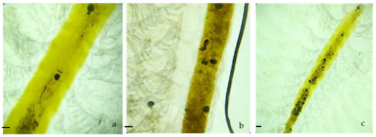 Artemia salina after 48 h of exposure to different MP concentrations: (a) 26 mg/dm3 of MPs, (b) 0.69 mg/dm3 of MPs and (c) 1.5 mg/dm3 of MPs. Scale bar (a–c): 200 µm.