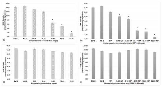 ChE activity of A. salina after 48 h of exposure to different contaminant concentrations: (a) simvastatin, (b) simvastatin + MP, (c) carbamazepine and (d) carbamazepine + MP. Error bars represent standard deviations. * Significantly different between controls and other treatments (p > 0.05).
