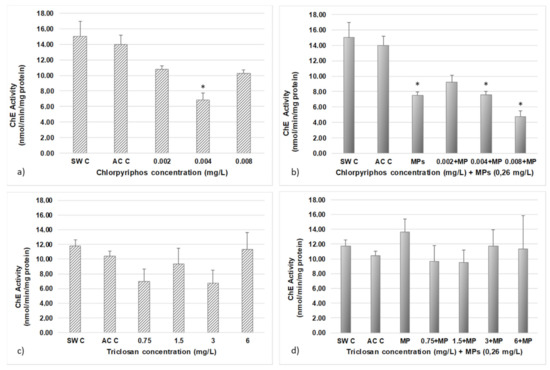 ChE activity of A. salina after 48 h of exposure to different contaminant concentrations: (a) CPF, (b) CPF + MP, (c) TCS and (d) TCS + MP. Error bars represent standard deviations. * Significantly different between controls and other treatments (p > 0.05).