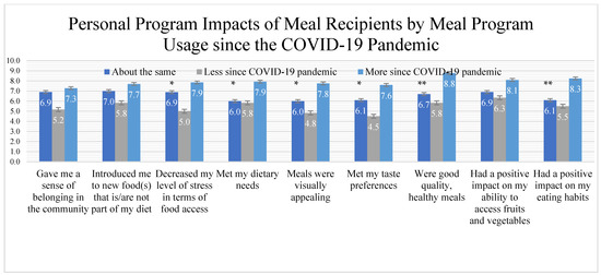 Likert Item Statements of Personal Impact of the Meal Service Program for Recipients. Data reported in means and standard error; * indicates p < 0.05 significant differences by utilization of meal services the since COVID-19 pandemic; ** indicates significance of p < 0.01.