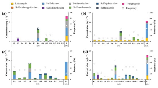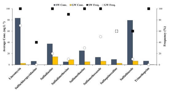 Balzer et al. (2016) reported that antibiotics entered surface waters through the effluents discharged from sewage treatment plants, sewage sludge, soil, groundwater, livestock excreta, and fertilizers containing livestock excreta; subsequently, pollutants from the surface water entered groundwater through the soil []. Accordingly, the observed concentrations and frequencies of antibiotics in the groundwater were lower than those in the surface water since the former could initially enter through other filtration and dilution media such as soils and streams.