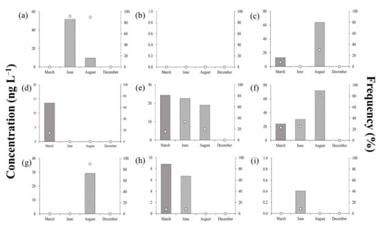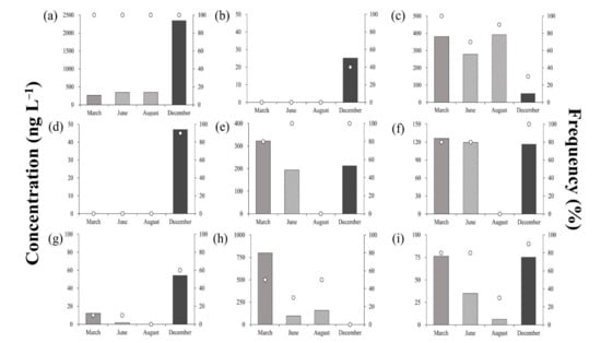 The average concentration of SDZ was <50 ng·L−1 across all seasons, peaking in August (43.5 ng·L−1), and reaching its minimum in December (17.3 ng·L−1; Figure 3d). Detection frequency was 100% in March, but was only 30% in December (three out of 10 points). Wei et al. (2011) reported a SDZ detection frequency and concentration of 55% and 1000 ng L−1, respectively []. Furthermore, their observed environmental SDZ concentrations varied across a wide range of BDL–1.06 ng·L−1, although it was generally higher than the concentrations obtained in the present study [,,].