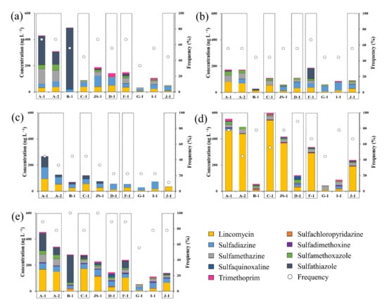 Residual concentrations and detection frequencies of antibiotics in surface water during the sampling campaigns; (a) Lincomycin, (b) Sulfachloropyridazine, (c) Sulfadimethoxine, (d) Sulfadiazine, (e) Sulfamethazine, (f) Sulfamethoxazole, (g) Sulfaquinoxaline, (h) Sulfathiazole, (i) Trimethoprim.