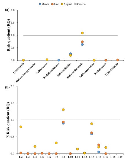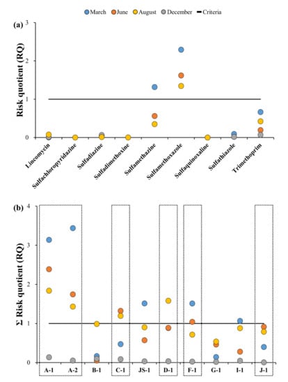 Since various antibiotics exist simultaneously within the environment, there is disconnection during evaluation of the risks of a location using the index of a single antibiotic; thus, ecological risks of the antibiotics in each location were evaluated by applying the concept of an additional effect (Figure 7b). If the sum of the RQs (ΣRQ) of each point obtained by applying the additional effect was <1, it was classified as no risk; in case it was between 1–10, it was classified as potentially hazardous; and in case it was >10, it was classified as the most hazardous. ΣRQ of the 10 sampling points ranged from 4.9 × 10−3 (J-1) to 3.4 (A-2), with no point classified as most hazardous; however, all points except for B-1, G-1, and J-1 were classified as potentially hazardous. At points A-1 and A-2, the ΣRQ was >1 for each month analyzed except August. In March, each of these points showed the highest ΣRQ values observed (3.1 and 3.4, respectively). ΣRQ was >1 at C-1 in June and December, whereas ΣRQ was >1 at F-1 in March and June. Thus, the periods where antibiotics showed the highest risk varied by location. The risks calculated in the present study depended on the region and time periods and tended to be high in regions where the environmental concentrations were high. Hence, it is believed that the environmental concentration plays an important role in the risk.