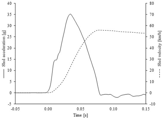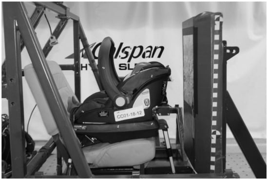 A calibrated Q1.5 ATD was used to represent an infant aged 18 months: mass, 11.1 kg; height, 0.8 m []. The head of the ATD was instrumented with a 3-axis accelerometer located at the center of gravity of the head. The upper neck of the ATD was instrumented with a 6-axis load cell. A strip of conductive foil was attached to the top of the head of the ATD so that a voltage signal identified contact with the conductive foil on the blocker plate, herein referred to as head contact. Sled tests were conducted according to the test matrix (Table 2). Data from ATD instrumentation were filtered, as specified by SAE International J211 [], and full time-histories of head accelerations and neck forces were extracted from which the following injury metrics were calculated: resultant head acceleration clip (3 ms), a3; head injury criterion (15 ms), HIC15; peak neck tensile force, FZ; and peak neck flexion moment, MY.