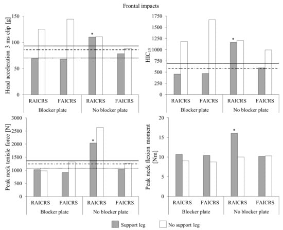 Head and neck injury metrics for the Q1.5 ATD in rearward-facing CRS models during frontal impacts with (shaded bars) and without (unshaded bars) a support leg. Q1.5 ATD head injury tolerance values (dotted lines) scaled from UN ECE R94 and 20% (dashed lines) and 50% (solid lines) risk of AIS3+ head injury tolerance values from Wismans et al. []. Note that there is no tolerance value scaled from UN ECE R94 for HIC15 and injury tolerance values for peak neck flexion moment are beyond the scale of the axis. Impact data for tests with the blocker plate were previously reported by Patton et al. []. RAICRS: rigid anchor infant child restraint system. FAICRS: flexible anchor infant child restraint system. * Denotes the impact test in which the support leg partially collapsed during the impact.