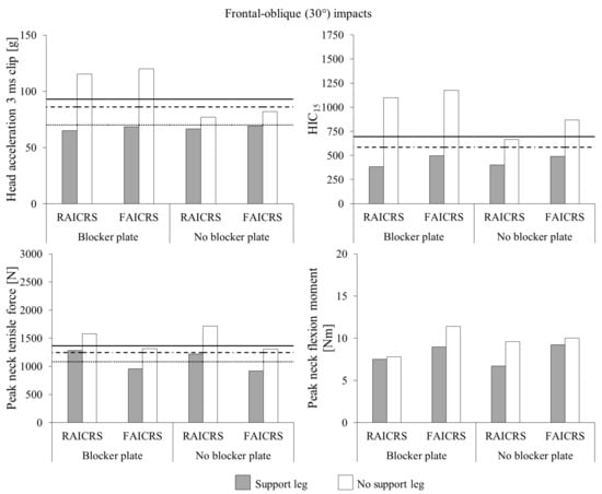 Head injury metrics were significantly lower for frontal-oblique impacts compared to frontal impacts, which suggested that the latter is the worst-case scenario. However, oblique principal directions of force have been found to be common in real-world crashes [,]. Therefore, finding that head injury metrics were significantly reduced below injury tolerance levels for frontal-oblique impacts is an important step in understanding how the presence of a support leg affects head injury risk during a real-world crash.