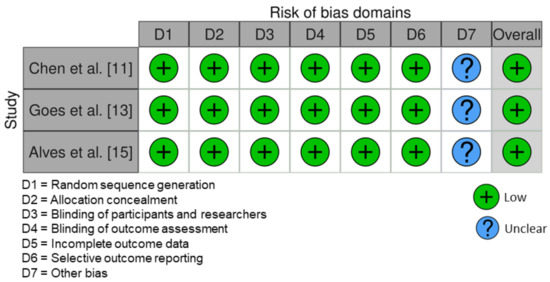- Sterne, J.A.C.; Savović, J.; Page, M.J.; Elbers, R.G.; Blencowe, N.S.; Boutron, I.; Cates, C.J.; Cheng, H.-Y.; Corbett, M.S.; Eldridge, S.M.; et al. RoB 2: A revised tool for assessing risk of bias in randomised trials. BMJ 2019, 366, l4898. [Google Scholar] [CrossRef] [PubMed] [Green Version]