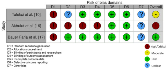 All RCT studies had a low risk of bias [11,13,15] (Figure 2). One non-RCT [17] had a low risk of bias according to ROBINS-I tool. The studies by Tufekci et al. [10] and Akbulut [16] had a moderate and high risk of bias, respectively (Figure 3).