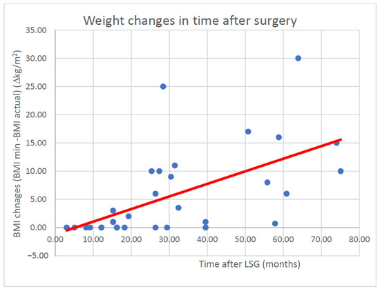 While evaluating the statistical data in the whole population examined using the Spearman’s rank-order correlation test for the minimum and current body weight, the correlation coefficient obtained for the whole population was 0.6628, and was very similar in the group of females in the study. Interestingly, in the group of males, this relationship was not confirmed; nevertheless, considering the small size of the group, this fact had no significant effect on the assessment of the whole population examined. Based on the equation of a straight line, it may be estimated that in accordance with such a model, after 12 months the body gain would be: −1.3907 + 0.2257 ∗ 12 = 1.32 kg.