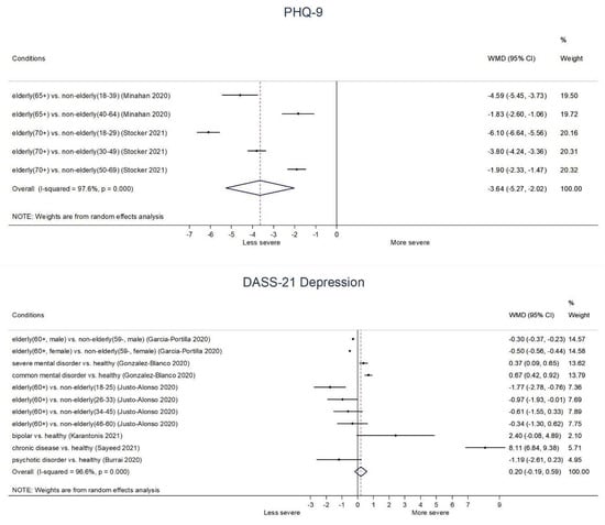 - Elderly: In the context of COVID-19, elderly (65+ or 70+) groups generally showed significantly lower depressive symptoms than non-elderly groups on PHQ-9 (WMD −4.59, 95% CI: −5.45 to −3.73 (65+ vs. 18–39 age); −1.84, −2.60 to −1.06 (65+ vs. 40–64 age); −6.10, −6.64 to −5.56 (70+ vs. 18–29 age); −3.80, −4.24 to −3.36 (70+ vs. 30–49 age); −1.90, −2.33 to −1.47 (70+ vs. 50–69 age)) as well as DASS-21 Depression score (−1.77, −2.78 to −0.76 (60+ vs. 18–25 age)); (−0.97, −1.93 to −0.01 (60+ vs. 26–33 age)). In addition, there was borderline significance between elderly (60+) group and 34–45 age group (−0.61, −1.55 to 0.33) or 46–60 age group (−0.34, −1.30 to 0.62) on DASS-21 Depression score. Moreover, both male elderly (60+) (−0.30, −0.37 to −0.23) and female elderly (60+) (−0.50, −0.56 to −0.44) showed significantly lower DASS-21 Depression score than male non-elderly (59−) and female non-elderly (59−), respectively (Figure 2).