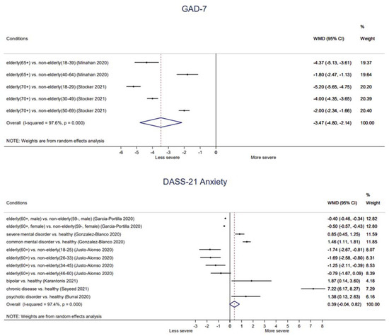 - Elderly: Elderly (65+ or 70+) groups generally showed significantly lower anxiety symptoms than non-elderly groups on GAD-7 (−4.37, −5.13 to −3.61 (65+ vs. 18–39 age); −1.80, −2.47 to −1.13 (65+ vs. 40–64 age); −5.20, −5.65 to −4.75 (70+ vs. 18–29 age); −4.00, −4.35 to −3.65 (70+ vs. 30–49 age); −2.00, −2.34 to −1.66 (70+ vs. 50–69 age)) as well as on DASS-21 Anxiety score (−1.74, −2.67 to −0.81 (60+ vs. 18–25 age); −1.69; −2.58 to −0.80 (60+ vs. 26–33 age); −1.25; −2.11 to −0.39 (60+ vs. 34–45 age)). In addition, there was borderline significance between elderly (60+) group and 40–60 age group (−0.79, −1.67 to 0.09) on DASS-21 Anxiety score. Moreover, both male elderly (60+) (−0.40, −0.46 to −0.34) and female elderly (60+) (−0.50, −0.57 to −0.43) showed significantly lower DASS-21 Anxiety score than male non-elderly (59−) and female non-elderly (59−), respectively (Figure 3).
