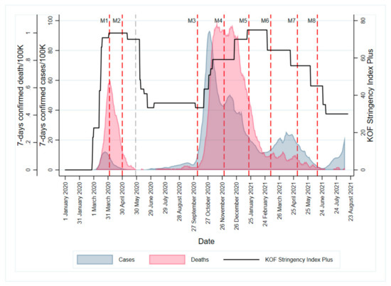HES-C measurement points and the course of the COVID-19 pandemic in Switzerland. Legend: Vertical dashed lines indicate the start of each survey wave, with red lines referring to those included in the present study; 7-day confirmed cases and death per 100,000 population are daily moving averages over 7 days. The KOF (Konjunkturforschungsstelle) Stringency Index Plus is an adopted version of the Oxford Stringency Index, which allows assessment of national and cantonal measures. The index ranges from 0 (=no governmental containment measures) to 100 (=full lockdown).