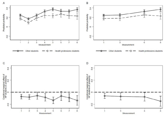 Predicted probability and conditional marginal effects of HP and non-HP faculty membership over time. Legend: Predicted adjusted probability of GAD symptoms for HP students and non-HP students in the restricted model (Model 1, panel (A)) and the full model (Model 4, panel (B)), covariates fixed at means. Panels (C) (restricted model) and (D) (full model) show respective differences in the probability of reporting GAD symptoms between HP students and non-HP students. Dots represent point estimates; whiskers represent corresponding 95% confidence intervals.