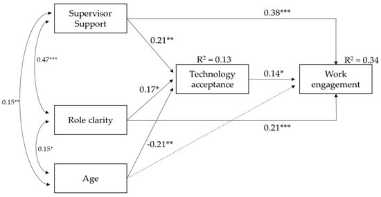 The estimated model, which is shown in Figure 2, fits to the data well: χ2 (0) = 0, p < 0.001, CFI = 1.00, TLI = 1.00, RMSEA = 0.00, SRMR = 0.00. In the model, both the supervisor support and role clarity showed a positive relationship with technology acceptance. In turn, technology acceptance was positively related to work engagement. Moreover, both supervisor support and role clarity had a direct positive association with work engagement. Age showed a negative association with technology acceptance. The model explained about 13% and 34% of the variance in, respectively, technology acceptance and work engagement. Table 2 showed the results of the bootstrapping procedure used to test indirect effects. They were significant in all cases confirming the partial mediation of technology acceptance.