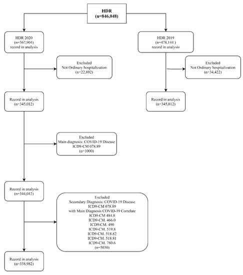 The total number of HDRs included in this study was 782,704: 443,722 from 2019 and 338,982 from 2020. In total, 57,314 HDRs were excluded because they were not for ordinary hospitalizations. Further, 1000 HDRs from 2020 were excluded because they were related to patients with a main diagnosis of COVID-19 and 5030 because they were HDRs of secondary diagnosis of COVID-19 and main diagnosis of COVID-related diseases (Figure 1).