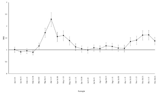 Standard rate ratio (SRR) and their 95% confidence interval between the years 2020 and 2019 for a fortnightly period. SSRs are statistically significant when the vertical bar of the confidence interval does not cross the horizontal line at the value 1.