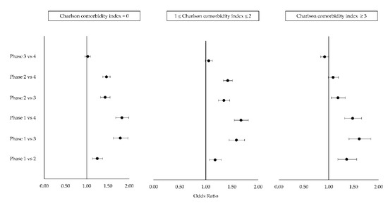 Regarding the interaction between the pandemic phases and the CCI class (Figure 3), a higher risk was found in the phase 1 compared to phase 4, in the lowest severity class (CCI = 0) (OR 1.83, 95% CI 1.68–1.99). The odds ratios did not result as statistically significant: for patients with CCI = 0, phase 3 compared to phase 4 resulted in an OR of 1.02 (95% CI 0.96–1.09); for patients in the class 1 ≤ CCI ≤ 2, the risk in phase 3 compared to phase 4 had an OR of 1.06 (95% CI 0.99–1.12); for patients in the class CCI ≥3, the risk in phase 2 compared to phase 4, and that for phase 3 compared to phase 4 had odds ratios of 1.09 (95% CI 0.99–1.19) and 0.92 (95% CI 0.84–1.00), respectively.