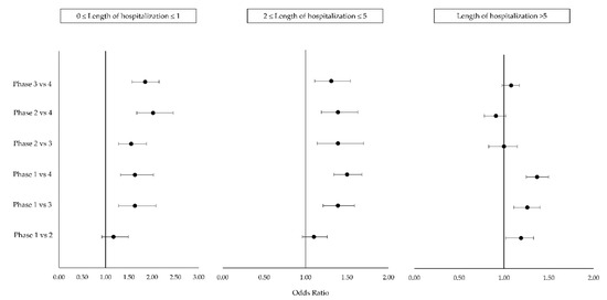The analysis of the interaction between the phases of the pandemic and LoS (Figure 4) showed that in the LoS classes of 0–1 day and 2–5 days, the ORs were all higher than 1, suggesting an increase of death risk for all the pairwise phases comparison. Moreover, given the lower confidence limit higher than 1, all odds ratios should be considered statistically significant with the exception for phase 1 compared with phase 2. In the LoS class of >5 days, the ORs of in-hospital mortality risk in phase 1 compared to phase 2 (OR 1.19, 95% CI 1.05–1.36), that of phase 1 compared to phase 3 (OR 1.26, 95% CI 1.12–1.41), and that of phase 1 compared to phase 4 (OR 1.37, 95% CI 1.24–1.49) were statistically significant. The other OR was not statistically significant (Figure 4).