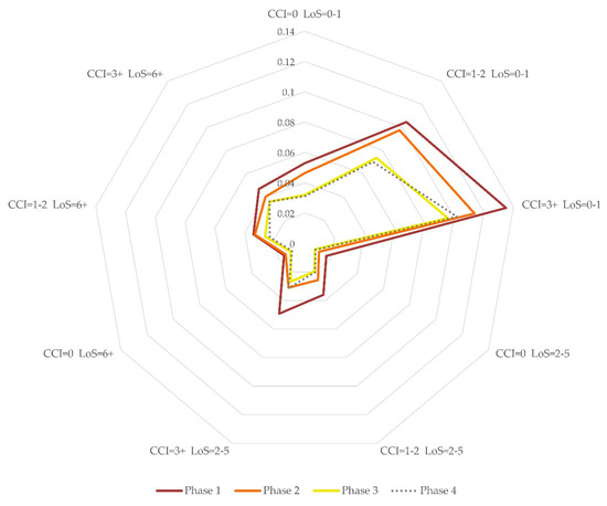 Figure 5 shows the predicted probabilities of in-hospital mortality estimated through the multivariable logistic model for the different phases and at every level of interaction with the LoS and CCI classes. The probability of death was generally higher in short-term hospitalizations (0–1 day) and in patients with more comorbidities (CCI > 3). In phase 1, the probability was higher than that in phase 2 and, with the same LoS, this difference is greater for CCI ≥ 3. The difference in the predicted probability of death between phases 1 and 3 was higher for CCI > 0. The difference between phases 2 and 3 was more evident for LoS of 0–1 day and greater when CCI = 1–2. No difference was evident between phases 3 and 4.