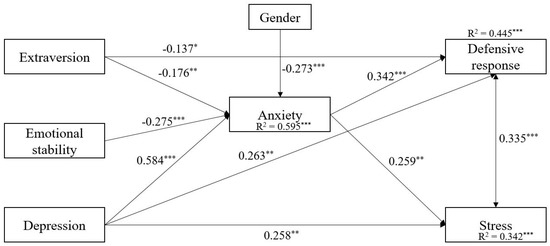 Specifically, results demonstrated a negative direct effect of extraversion on both defensive response, β = −0.137, SE = 0.06, p = 0.025, and anxiety, β = −0.176, SE = 0.05, p = 0.001, as well as a negative correlation between emotional stability and anxiety, β = −0.275, SE = 0.06, p < 0.001. Conversely, we found a direct and positive relationship between depression and both defensive response, β = 0.263, SE = 0.08, p = 0.001, and stress β = 0.259, SE = 0.08, p = 0.002 and between depression, β = 0.584, SE = 0.06, p < 0.001 and anxiety, respectively. Finally, anxiety was related with both defensive response, β = 0.342, SE = 0.08, p < 0.001, and stress, β = 0.259, SE = 0.09, p = 0.003.