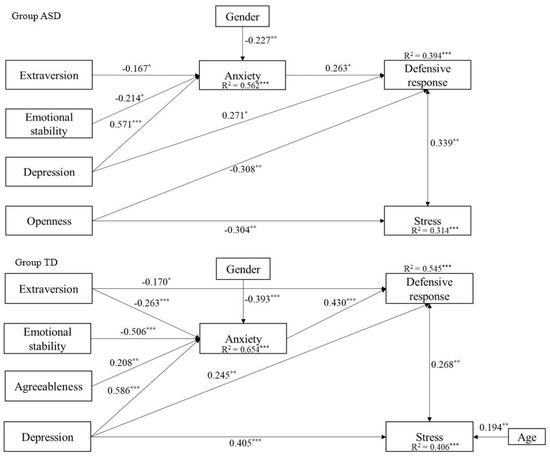 In this study, we provide a new relationship model to shed new light on the complex interaction between stress, psychological, and personality traits, considering gender, in parents of children with and without autism. We confirm that raising a child with autism involves experiencing significantly higher levels of stress [66,67], anxiety, and depression [5,11,37,68] with respect to demographically matched parents of children with TD [46] (Table 2). Starting from this evidence, we used a path-SEM analysis to define the interplay between personality, anxiety, and mood status on stress levels, considering gender. Considering the pooled data, we found that some aspects of personality traits such as extraversion and emotional stability as well as depression and gender are the main relevant factors that predict the levels of stress in both groups of parents. It is noteworthy that the influence of these factors is mainly mediated by levels of anxiety. In particular, extraversion and emotional stability are negatively associated with the defensive response through the mediating effect of anxiety, while depression is positively associated with defensive response and stress both directly and through anxiety. These findings suggest that low scores in extraversion, emotional dysregulation, and depression are mainly related to a lack of control over psychological defensive responses and elevated distress. Anxiety exerts a pivotal role in this path model, consistently mediating the effect of predictive variables on stress domains. Furthermore, the effects of psychological and personality traits are also affected by gender, which exerts a direct influence on anxiety. Mothers display a significantly higher association with anxiety than fathers, and it in turn influences the effect on defensive response and stress. These findings are in line with recent evidence showing higher levels of stress in ASD mothers when compared to fathers in relation to parental emotion regulation, family functioning, and educational level [69].