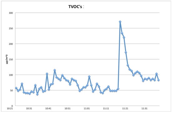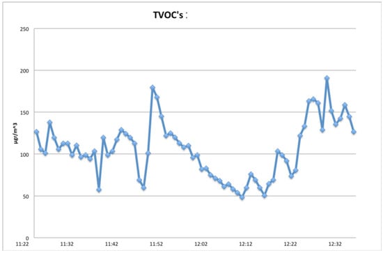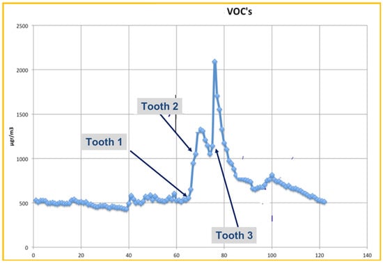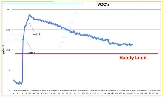 Measurements on D11 covered a 2-h time period and all windows were closed at the time (Figure 5). During the first hour, TVOCs’ concentration values varied between 450 μg/m3 and 600 μg/m3. These levels were already above the recommended values and this can be attributed to the other dental activities taking place in the clinic in combination with low ventilation. A detailed description of basic dental works’ influence on TVOC’s has been described in the literature [].