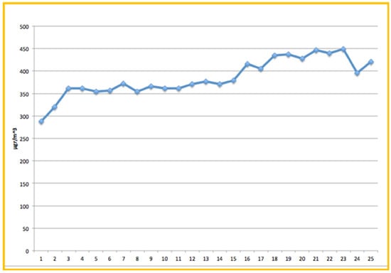 Background levels of TVOCs, during the operation of the dental Clinic without any laser activity, and no ventilation. The negative impact of no-ventilation during dental activity on the air quality, is obvious (safety limit is considered at 300 μg/m3).