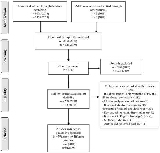Criteria for inclusion were that the articles must: (1) include children and/or adolescents (aged 0–19 years); (2) simultaneously analyze PA, diet, and SB by applying data-based cluster statistical procedures (studies could also include additional behaviors); and (3) be published in English, Portuguese, or Spanish. Exclusion criteria was that articles must not include clinical populations (e.g., disabilities, metabolic and/or cardiovascular diseases).
