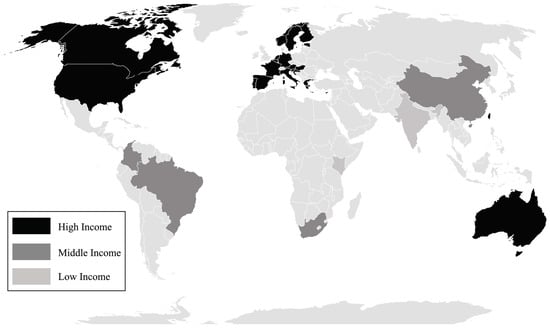 A country’s income classification was performed according to The World Bank (low income, lower middle income, upper middle income and high income) considering data collected year of each study (https://datahelpdesk.worldbank.org/; accessed at 7 July 2021).