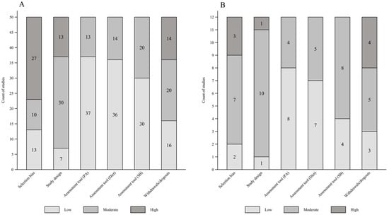 In risk of bias assessment (see Table S4), several studies from high-income countries failed to achieve at least 60% of the eligible response, which compromised the sample representativeness. This occurred at a lower frequency among studies from middle-income countries. In addition, a percentage of ≥80% of participants who completed the study was observed in less than half of included studies, regardless of the income level of the countries. On the other hand, almost all studies in all income levels, except one [], presented information that enables replication of the tool of PA, diet, and SB. In Figure 3, a higher frequency of studies with a high risk of bias was observed for items selection bias among those from high-income countries and assessment tool of SB for studies from middle-income countries. The assessment tool of PA and diet were the items most frequently classified with low risk of bias among studies for both income levels of the countries (Figure 3). In the two studies from low-income countries, a low risk of bias for the assessment tool of PA and diet was observed. Half the studies showed a low risk of bias, and half a moderate risk for the selection bias, assessment of SB, and withdrawals/dropout items. For the study design item, one study was classified as having a moderate risk of bias and the other study with a high risk of bias (data not shown).