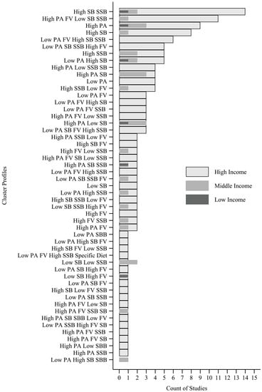By applying cluster analysis (i.e., k-means, Ward’s method, latent class analysis, and latent profile analysis), 51 cluster types were identified, and 42 included at least one negative behavior (e.g.; low consumption of F&V). Two [,] studies identified clusters considering a sample of more than one country income levels and were not included in counts. Clusters that appeared the most across studies presented in all income classifications, Figure 4, were the “High SB and SSB” (n = 17) [,,,,,,,,,,,,,,,], “High PA” (n = 13) [,,,,,,,,,,,], “Low PA High SB” (n = 8) [,,,,,,,,], and “High PA and Low SB” (n = 7) [,,,,,]. Cluster type “High SB” (n = 9) [,,,,,,,,,] was found only in upper middle and high-income countries. The healthiest, characterized by all behaviors being healthy, “High PA and F&V Low SB and SSB” profile (n = 12) [,,,,,,,,,,,,,], was present only in upper-middle- and high-income countries, while the unhealthiest, characterized by all behaviors being unhealthy, “Low PA and F&V High SB and SSB” profile (n = 6) [,,,,,,,] was present only in high-income countries.