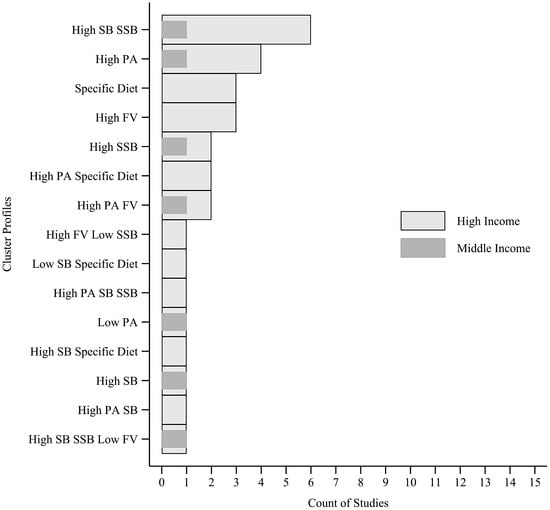 By applying dimensionality reduction procedures (i.e., principal component analysis, multiple corresponding analysis, and factorial analysis), 15 cluster types were identified, and nine included at least one negative behavior (Figure 5). The two most prevalent cluster types found in high-income countries were also present in upper-middle-income countries. There was no evidence from low-income countries, and few cluster types were found in upper middle-income compared to high-income countries. A large proportion of studies reported clusters characterized by “High SB and SSB” (n = 7) [,,,,,,,], followed by “High PA” (n = 5) [,,,,,], “Specific Diet” (n = 3) [,,,], and “High F&V” consumption (n = 3) [,,,].