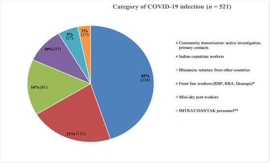 Among the occupational categories, more than one third of COVID-19 patients were private and business workers. This is the case because the Phuentsholing municipality is the place in which many Bhutanese entrepreneurs and private workers operate their businesses. The Phuentsholing municipality provides the main platform for trade between Bhutan and India. Therefore, these groups of people are at higher risk for SARS-CoV-2 infection as they are more frequently involved in interaction and travel. Previous studies also suggested that COVID-19 cases could be related to occupational exposure in a significant proportion of cases [24,25].