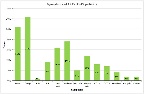 The proportion of different symptoms manifestations among COVID-19 patients. SOB- shortness of breath; RS- runny nose; LOSS- loss of smell sensation; LOTS- loss of taste sensation; Abd pain- abdominal pain; Others—chest pain, nausea, skin rashes.