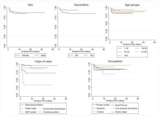 Survival analysis was carried out to estimate the cumulative probability of the onset time of symptoms for each risk factor. Kaplan–Meier curves were used to estimate the probabilities for the onset of symptoms at different time points, and a log rank test was employed to assess the differences between covariates [22]. Here, survival time corresponds to the total number of days elapsed between the date of isolation and the date of onset of symptoms (hazard). The Cox proportional regression model was used to estimate hazard ratios (HR) and the corresponding 95% confidence intervals for symptomatic cases for all possible risk factors (including age, sex, vaccination status, and occupational group).
