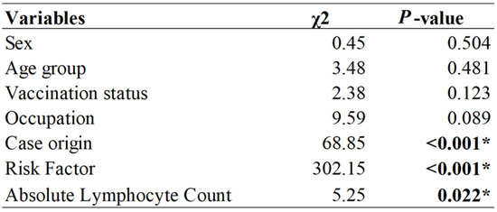These results were further supplemented by the significant differences in the logrank tests for origin of cases (p < 0.001) and presence of risk factors (p < 0.001) for absolute lymphocyte count (p = 0.022) (Figure 5).
