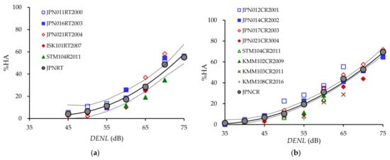 For road traffic noise, %HA values for JPN010RT1999 differs considerably. The %HA values are 50% and 74% at 55 dB and 65 dB, respectively. These percentages are 30% or higher than other datasets. In addition, 4 datasets from JPN003RT1994 through JPN009RT1998 have lower %HA than those after JPN011RT2000. The average value of %HA of the former datasets at 60 dB is approximately 9%, whereas that of the latter datasets is approximately 21%.