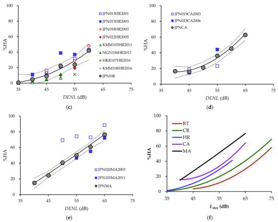 Table 6 shows the association between DENL and %HA for each dataset. It should be noted that Table 6 is sorted in chronological order for each transportation noise. In the case of sample sizes of less than 25 (hyphen in the table), we did not calculate %HA. Table 6 shows that remarkable variance between datasets is observed even for the same transportation noise.