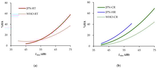Comparison between estimated exposure–annoyance curves derived from Japanese and WHO datasets: (a) Japanese road traffic noise (JPN-RT) vs. WHO road traffic noise; (b) Japanese conventional railway noise (JPN-CR) and Shinkansen railway noise of (JPN-HR) vs. WHO railway noise WHO-Rail). Both figures were drawn by interpolating the noise level in 1-dB units.