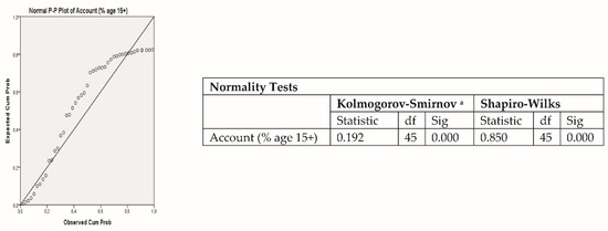 The variable owning an account follows an approximately normal distribution at the European level, as can be seen from the normality plot, confirmed by the Kolmogorov–Smirnov test (Figure 3).