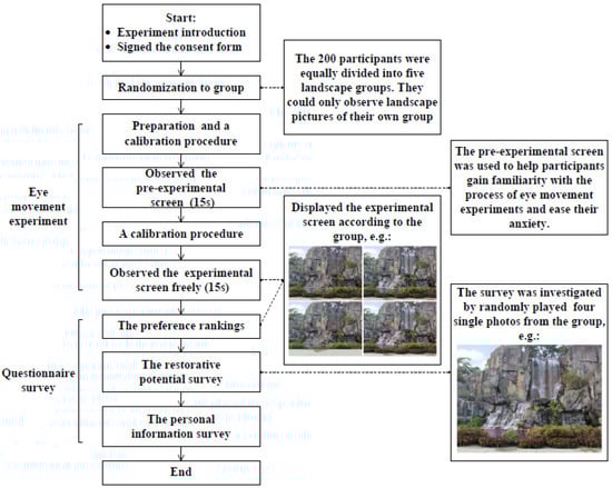 The experimental process flowchart is illustrated in Figure 2. All participants were tested individually. Upon their arrival, participants were informed of the study’s purpose and procedures in detail and were given a consent form to read and sign. We would divide the participants into groups according to the requirements in the 2.1. Study design section above. On agreeing to participate in the experiment, the respondents were positioned in front of a monitor fitted with the eye tracker. During the experiment, the participants placed their heads on a chin rest to minimize their head movements and viewed a monitor placed 55 cm from the surface of their cornea. Each participant was then asked to follow a black circle on the monitor with their eyes to calibrate the eye tracker. Calibration was completed using a nine-dot calibration procedure that allowed the eye-tracking system to match the pupil-center/corneal reflections related to the specific x-y coordinates of the dot []. After the calibrating procedure was completed, the participants were presented with a pre-experiment image on the monitor, for 15 s. The pre-experiment image was used to help participants gain familiarity with the process of eye movement experiments and ease their anxiety to reduce potential errors in the eye movement data.