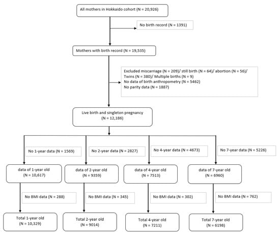 The Hokkaido Study on Environment and Children’s Health is a prospective birth cohort that was started in 2002; further information about this cohort can be found elsewhere [27,28,29]. From February 2003 to March 2012, the Hokkaido cohort included Japanese women recruited during early pregnancy (13 weeks of gestation), who visited the maternity unit in one of the 37 hospitals and clinics in the Hokkaido Prefecture, Japan. These 37 health services covered the entire Hokkaido area. Figure 1 shows the flowchart of the participants. The cohort consisted of 20,926 pregnant women. As the focus of this study was HDP, we selected mothers who had their medical records of pregnancy. We excluded mothers with miscarriages, stillbirths, abortions, twins, and multiple births. To calculate z-scores, mothers who did not have information on parity and anthropometry of their children at birth were excluded. Thus, we included mothers with live births and singleton pregnancies. Children with no information on anthropometric measurements at one, two, four, and seven years were excluded. We included 12,186 participants from the time of their birth. In total, we included the data obtained from participants at one year (n = 10,329), two years (n = 9014), four years (n = 7211), and seven years (n = 6198), and assessed the associations between HDP and anthropometric measurements.