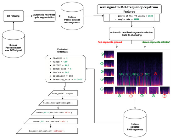 Relying on these ascertainments, this research aims at proposing a reliable CVD screening based on PCG signal classification. Particularly, an automatic method for PCG heart sounds analysis and classification, which is useful to detect heart pathology in clinical applications. The main contribution of our work concerns the proposition of a new and powerful preprocessing approach based on: infinite impulse response (IIR) filter for automatic noise deletion, an automatic powerful heart cycle segmentation (HCS) method based on envelop detection using Daubechie’s wavelet decomposition, a new HCS segment selection approach based on PCG feature clustering relaying on Gaussian mixture model (GMM). This new preprocessing approach is experimented on both Pascal and PhysioNet datasets with an extensive experimental study based on 17 convolution neural network (CNN) pretrained and fine-tuned models for the automatic PCG disease classification.