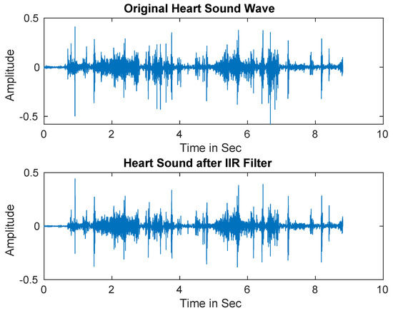 In practice, PCG signals are often corrupted by different types of noise that may decrease the detection accuracy. Therefore, IIR filter was first utilized to separate the noise from the signals [69]. Figure 2 shows the original heart sound signal versus the denoised signal.