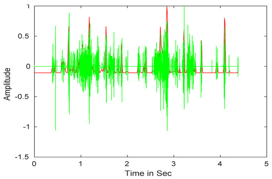 After that, we performed the wavelet reconstruction to extract the low-frequency heart sound. Finally, we computed Shannon entropy (see Equation (3)), then, the average Shannon entropy is standardized as seen in Equation (4) [70]. The envelope of input signals is shown in Figure 3.