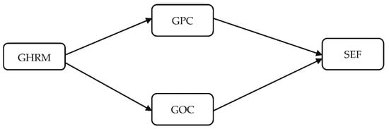 Two hypotheses were used to describe this theoretical research model. In the first place, we used the ability-motivation-opportunity (AMO) theory. According to the AMO theory, capacity, motivation, and opportunity are the components in HRM activities that describe how HRM actions increase an organization’s human resources by increasing their competence, resulting in better outcomes, less waste, and a sustainable green climate. In addition, our study further supports the principle of the SVF, which confirms how personal beliefs affect employee behavior. Moreover, [42] has observed that personal environmental thoughts play a significant role in the eco-friendly actions of workers. Therefore, the SVF theory supports the structure suggested in this research by providing an organization with an atmosphere that promotes the personal beliefs of its workers and thus improves its environmental efficiency. In our study, the dependent variable is sustainable environmental efficiency (SEF). Because different multinationals may integrate the ethical responsibility and institutional push for green behaviors in their business operations with the use of environmental management practices to enhance their environmental performance. For this purpose, better results can only be achieved by focusing on sustainable environmental efficiencies and these have their impact on management systems. GHRM progressively investigates human resources and their environmental efficacy. The investigation of the relationship between GHRM and SEF can better explain the mechanisms through which they impact environmental and economic performances [50]. In contrast, the green human resources management (GHRM), green physiological climate (GPC), and green organizational culture (GOC) are used as a mediator between GHRM and SEF. Figure 1 shows the research model for determining the mediating impacts.