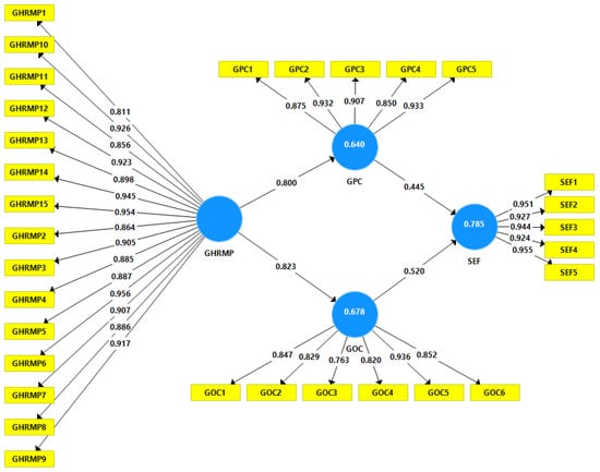Figure 2 shows the outer loadings and path analysis values from H1, H2, H3, and H5. Table 6 also contains beta, SD, T Statistics, and p Values. These values show that H1, H2, H3, and H5 have a strong positive relationship. According to the conclusions, the effect of “GHRMP” on “GPC” and GOC is (β = 0.800, p = 0.000) and (β = 0.823, p = 0.000), respectively. The impact of “GPC” on “SEF” is (β = 0.445, p = 0.000), and “GOC has the impact on “SEF” is (β = 0.520, p = 0.000).