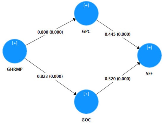 Figure 3 and Table 7 are showing the mediation analysis of the model. According to results, “GPC” and “GOC” strongly mediates the between “GHRMP” and “SEF”. E.g.,: (β = 0.356, p = 0.000) and (β = 0.428, p = 0.000) respectively.