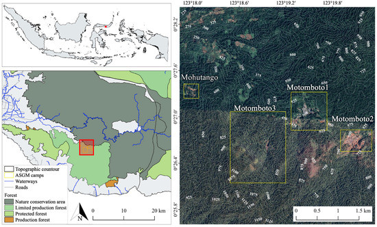 The first mining activities in Bone Bolango Regency occurred in the Dutch era (18th century) [30]. Much later, mining activity in the West Motomboto and Tulabolo areas was developed by Tropic Endeavour Indonesia in 1988 [31]. However, these mining sites were closed in 1991 because they overlapped the area being developed into the Bogani Nani Wartabone National Park [31]. The closure of the former mining site triggered the entry of residents to carry out mining activities [31]. In 2013, more than 9000 small-scale miners were reported in the Bogani Nani Wartabone National Park [32].